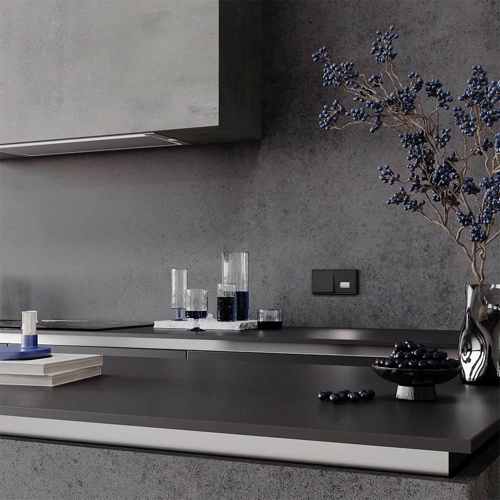 В таком интерьере электроустановочные изделия не прячутся — они становятся частью индустриальной композиции.